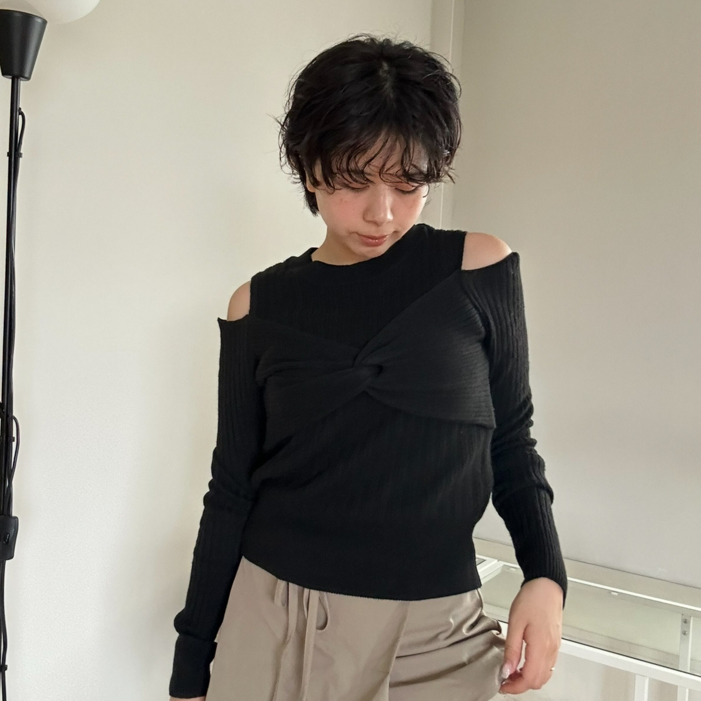 肩部分にカットデザインのあるニット。